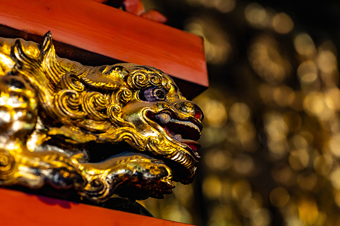 屋根大棟には紋瓦が現在3つあり、中央に天皇勅願寺を表す菊花紋、東に十五弁の葵紋、西には徳川家康公の子、結城秀康公・結城家の左巴紋が並びます。また、破風板・懸魚等には豪奢な彫り物、向拝の手狭にはリスやブドウの彫り物も見られ、法然上人の祀られる御堂の格式はより重厚なものとなり、信仰の篤さの表れと言えましょう。