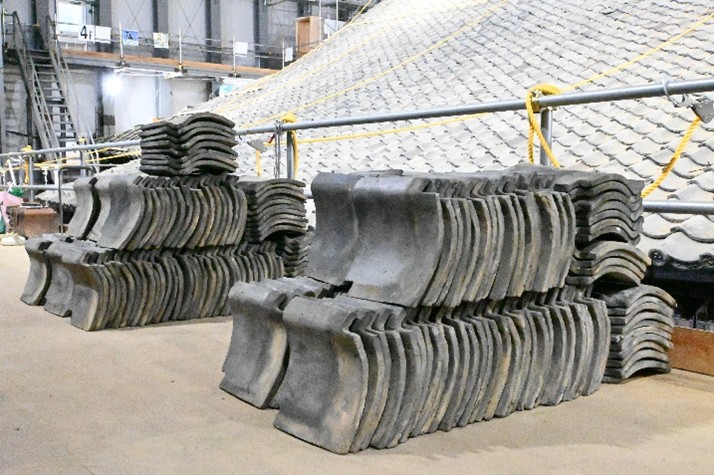 取り外された瓦が仮置きされている様子。きれいに整列しています。