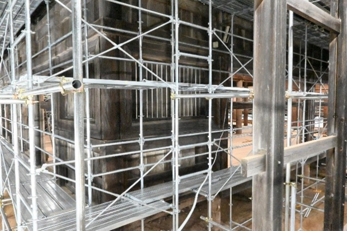 御影堂の室内外には仮設足場が立てられ、造作の取り外しなどが進められていきます。