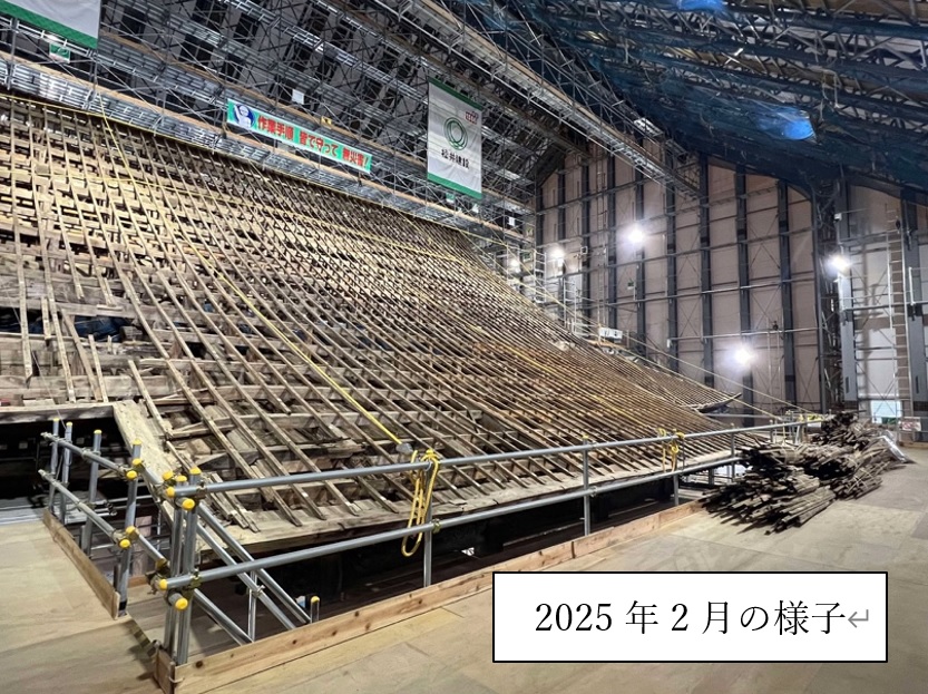 2025年2月撮影。野垂木(のだるき・縦方向の材)がまだ残っていました。