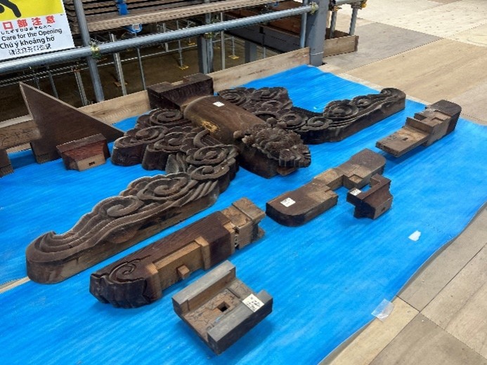 妻飾りに用いられていた太瓶束(たいへいづか)も取り外され、これまで目にすることが難しかった彫刻の細部をじっくりと観察することができました。普段は屋根の高所にあって見えない部分にも、当時の職人さんの手による豊かな意匠が施されています。