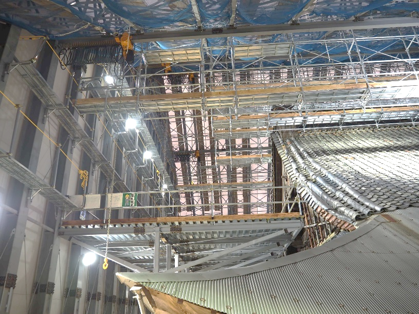 御影堂を覆う覆屋の中に照明器具、天井クレーンが取りつき、ついに覆屋の工事が概ね完了しました!