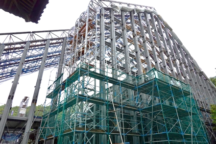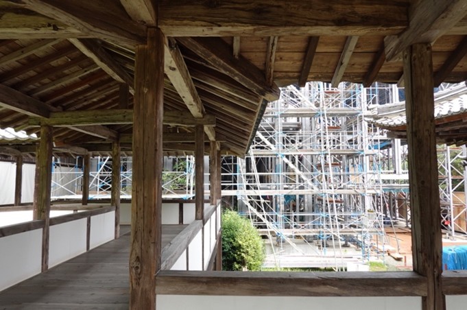 ⑥四修廊下からは間近に覆屋の鉄骨を見ることができます。