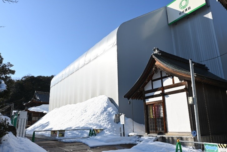 覆屋建設後初めての冬ですが、覆屋の屋根から落ちたたくさんの雪が前面に積もりました。