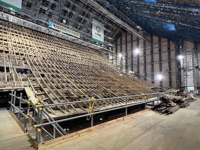 御影堂の屋根野小舞の取り外しが完了し、野垂木(屋根の流れに沿って取り付けられる細長い材)の状態となりました。(正面)