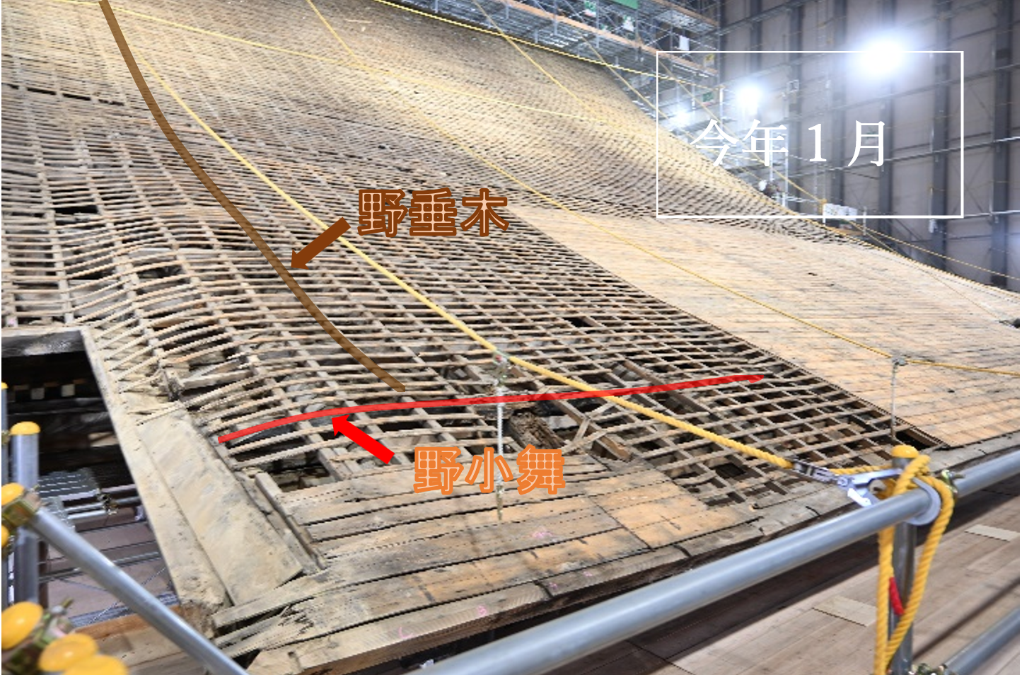 屋根野小舞(のごまい)の取り外しが完了し、野垂木(のだるき)の様子を覗けるようになりました。