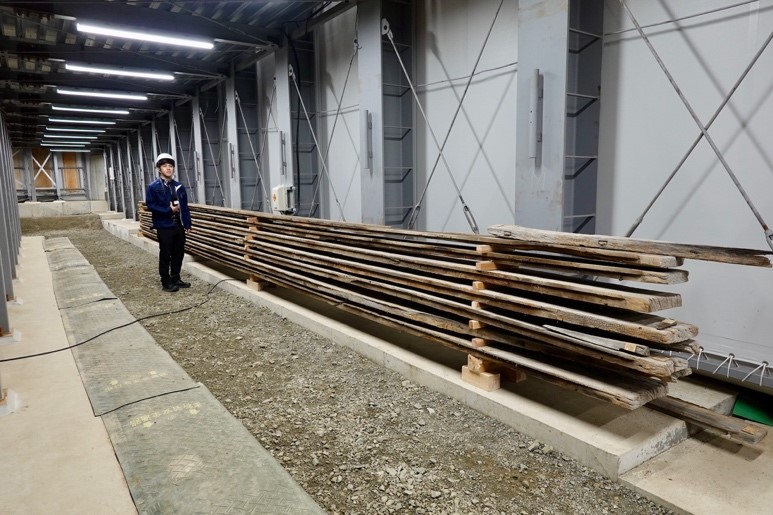 正面階段の踏板は、長さ12メートルのケヤキの一枚板。文化財課担当Mさんが横に立つと、その長さがよく分かります。