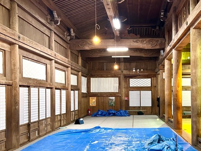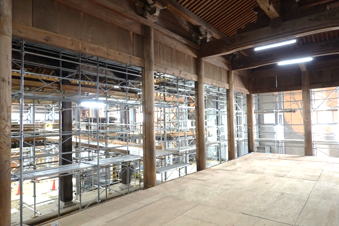 写真1枚目は御影堂室内で、現在、造作の取り外しが進んでいます。写真2枚目の工事開始前と比較すると、建具、そして造作の板壁や長押(なげし)などが取り外されていることがわかります。