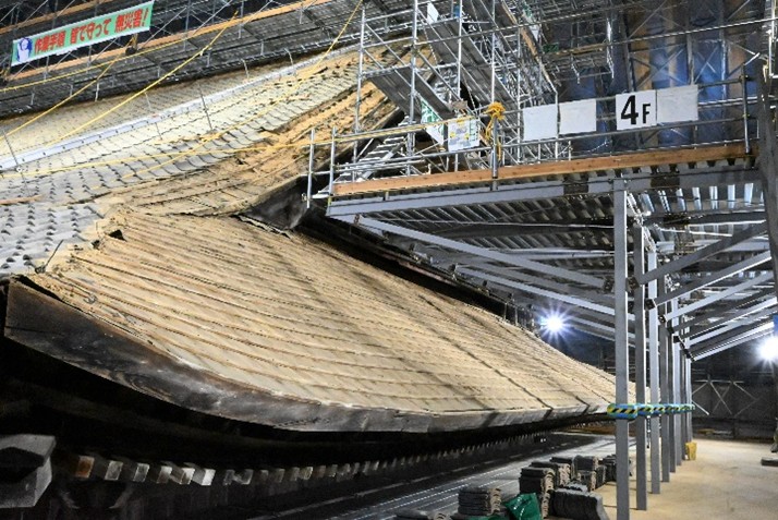 枚数にして約16,000枚、一枚一枚手作業で丁寧に取り外されました。取り外した瓦は、もう一度使用できるかを確認して、保管されます。瓦を取り外すと、屋根の下地が現れました。下地は、瓦下に吹き込んだ雨が漏らないよう、薄い板で葺く土居葺(どいぶき)、杉皮葺(すぎかわぶき)、ルーフィングシートなどが施されていました。修理時期によって材料が異なり、これまで何度か修理されてきたことがわかります。