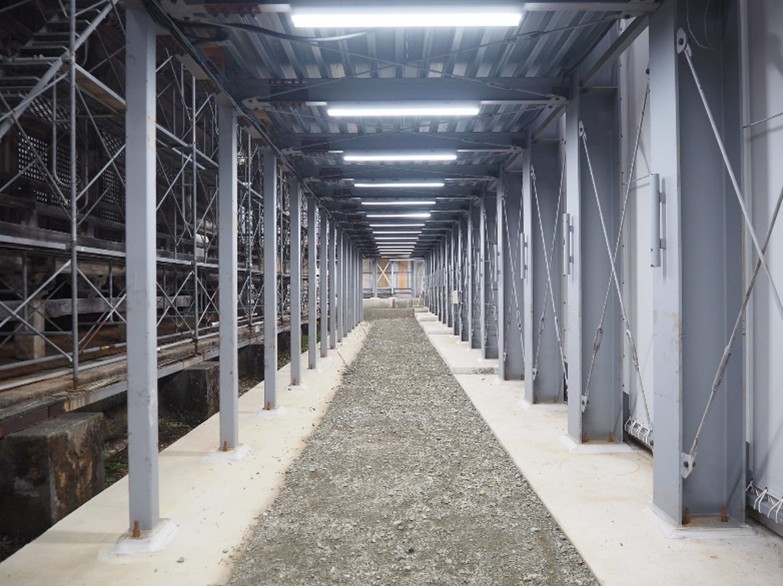 覆屋の天井にクレーンが取りつきました。重い荷物を吊り上げて、運搬することができます。