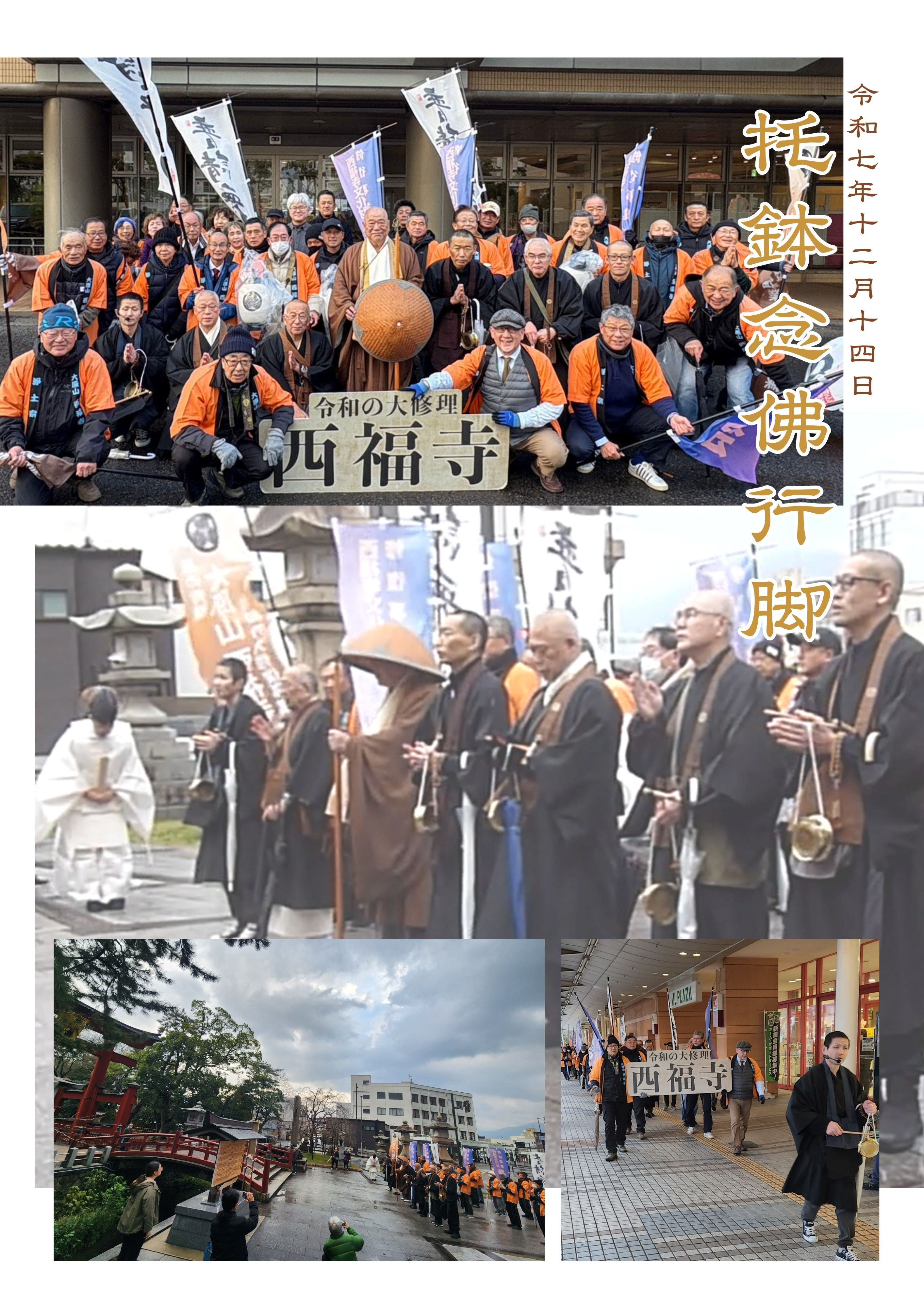 「托鉢念佛行脚&特別講演会」 令和7年12月14日 僧俗一体の托鉢念佛行脚と特別講演会を実施いたしました。 《目的》 1.歳末市内念佛浄化と繁栄の祈願。 2.西福寺令和の大修理事業の周知。 3.寺檀奉賛会等工事関係者の結束。 ご参加くださいました皆様に心より御礼を申し上げます。 合掌